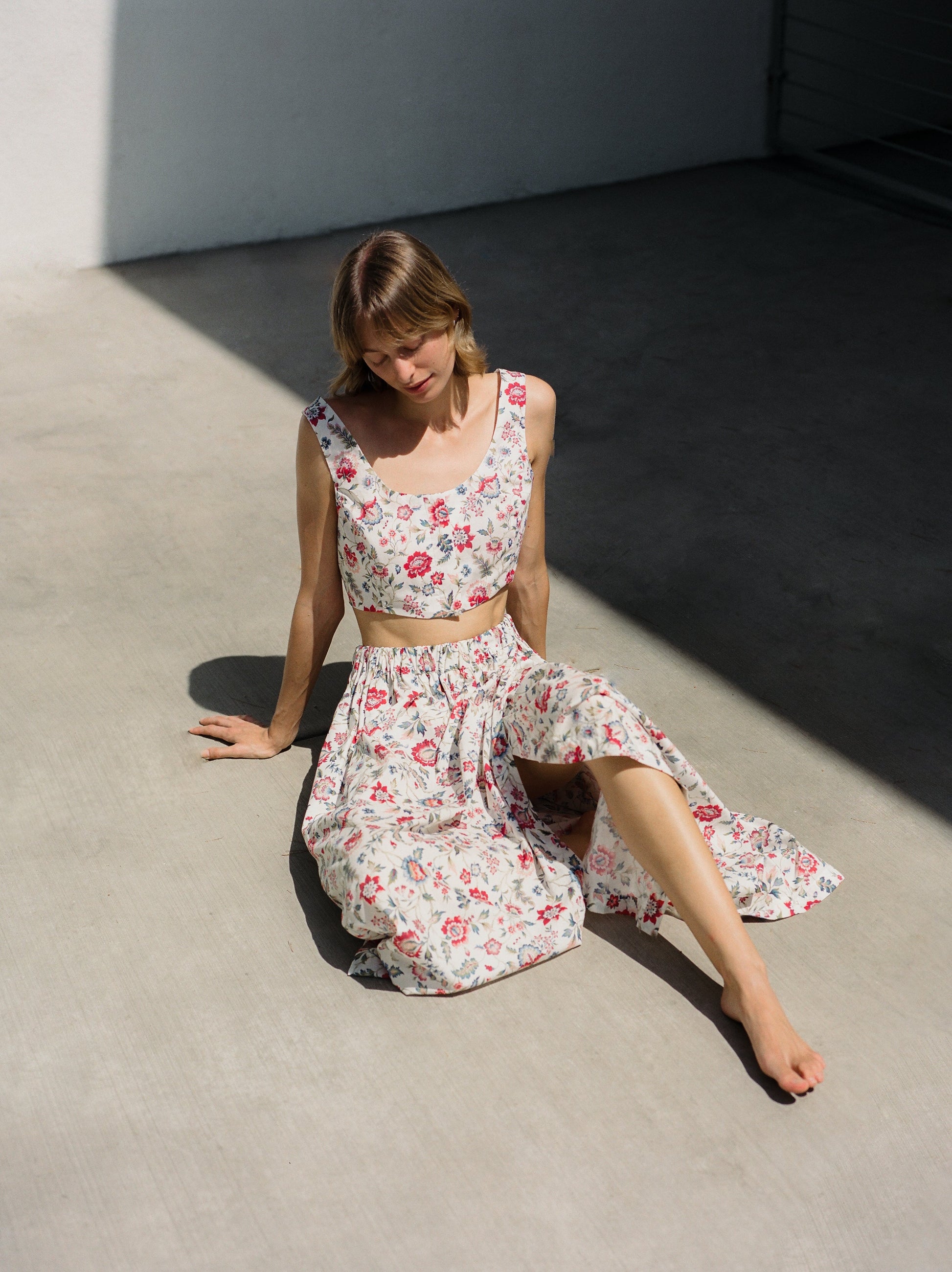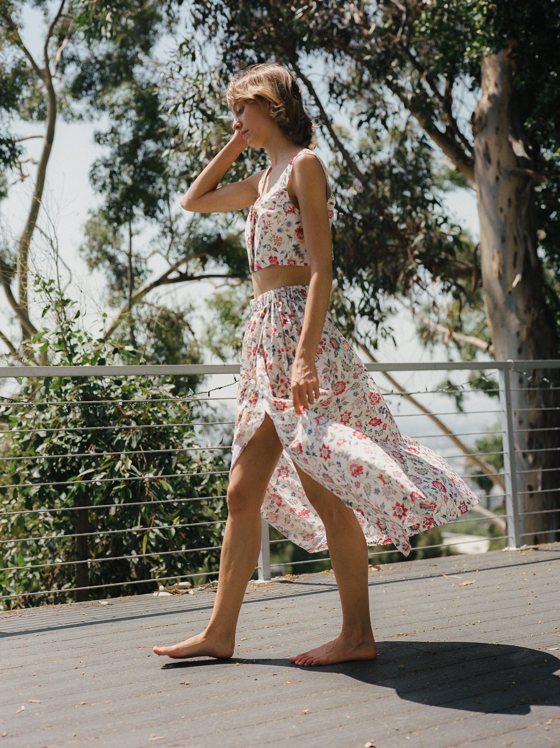 The Adelaide Bra Top is constructed in classic Liberty of London Tana Lawn Cotton and fully lined in a soft cotton poplin. Perennial Floral is reminiscent of French country chintz designs. With covered button front and princess seams this top is the perfect flirty top with matching skirt or a fun pant.