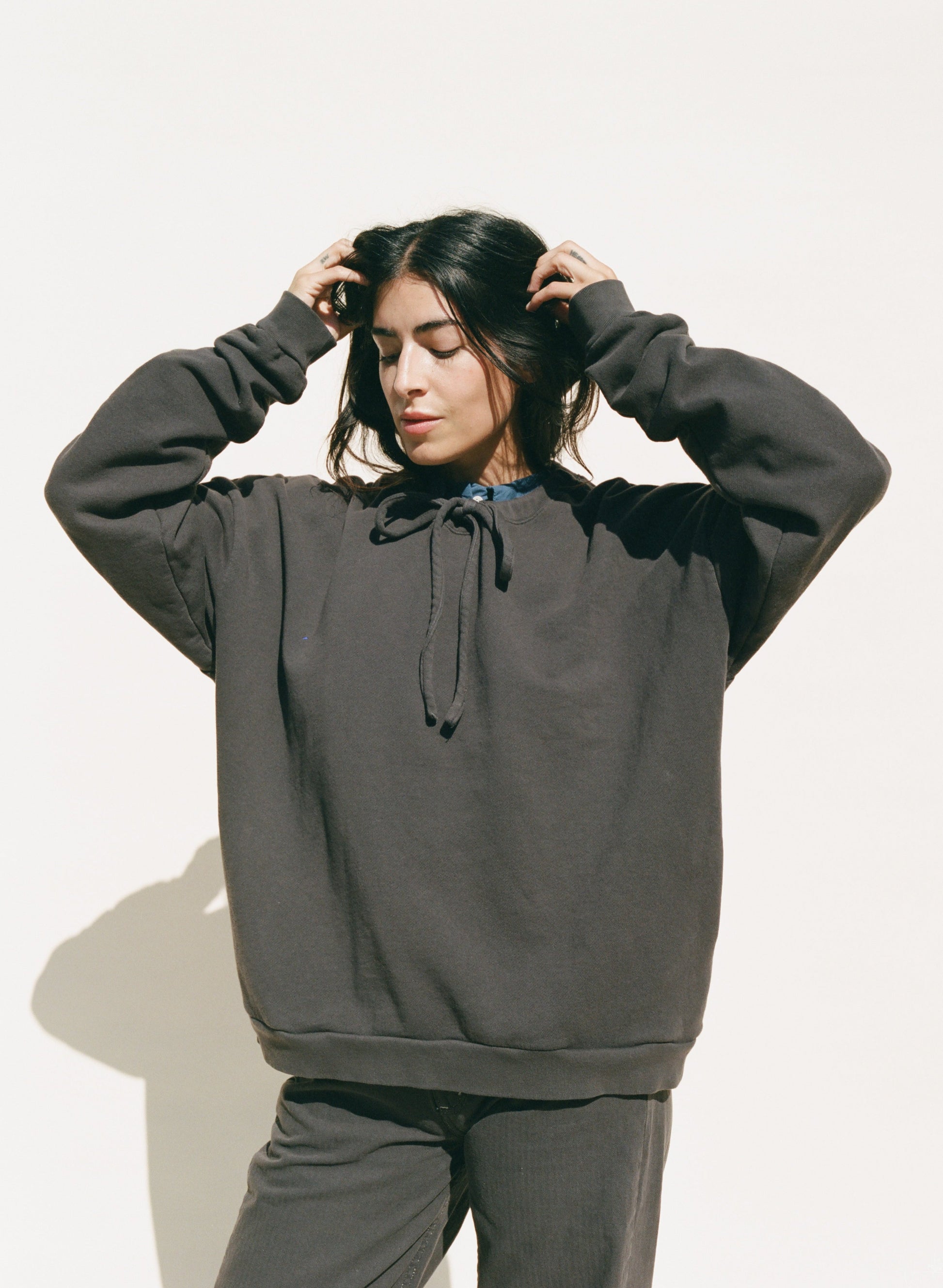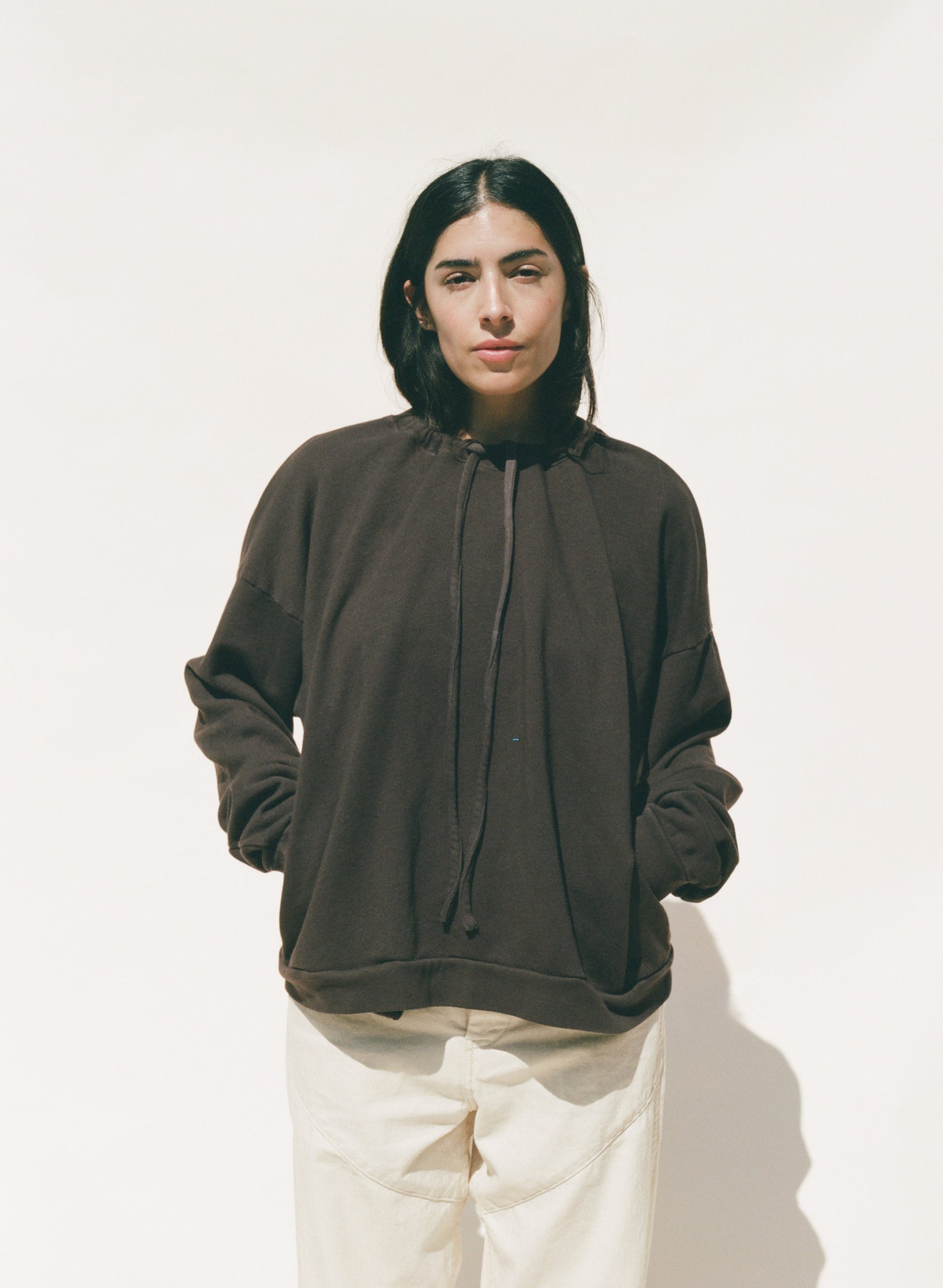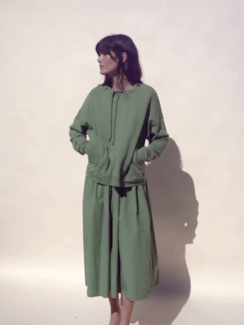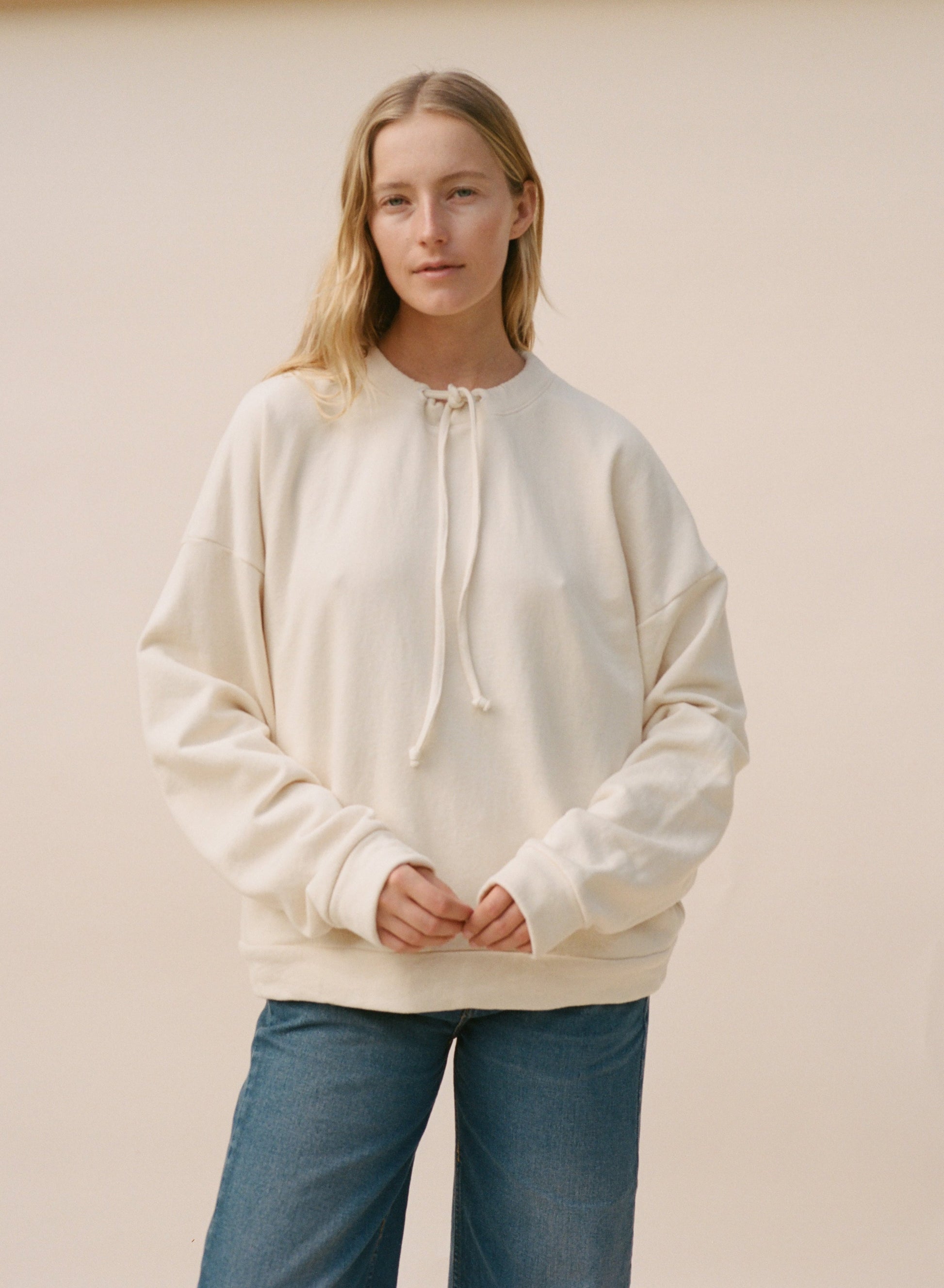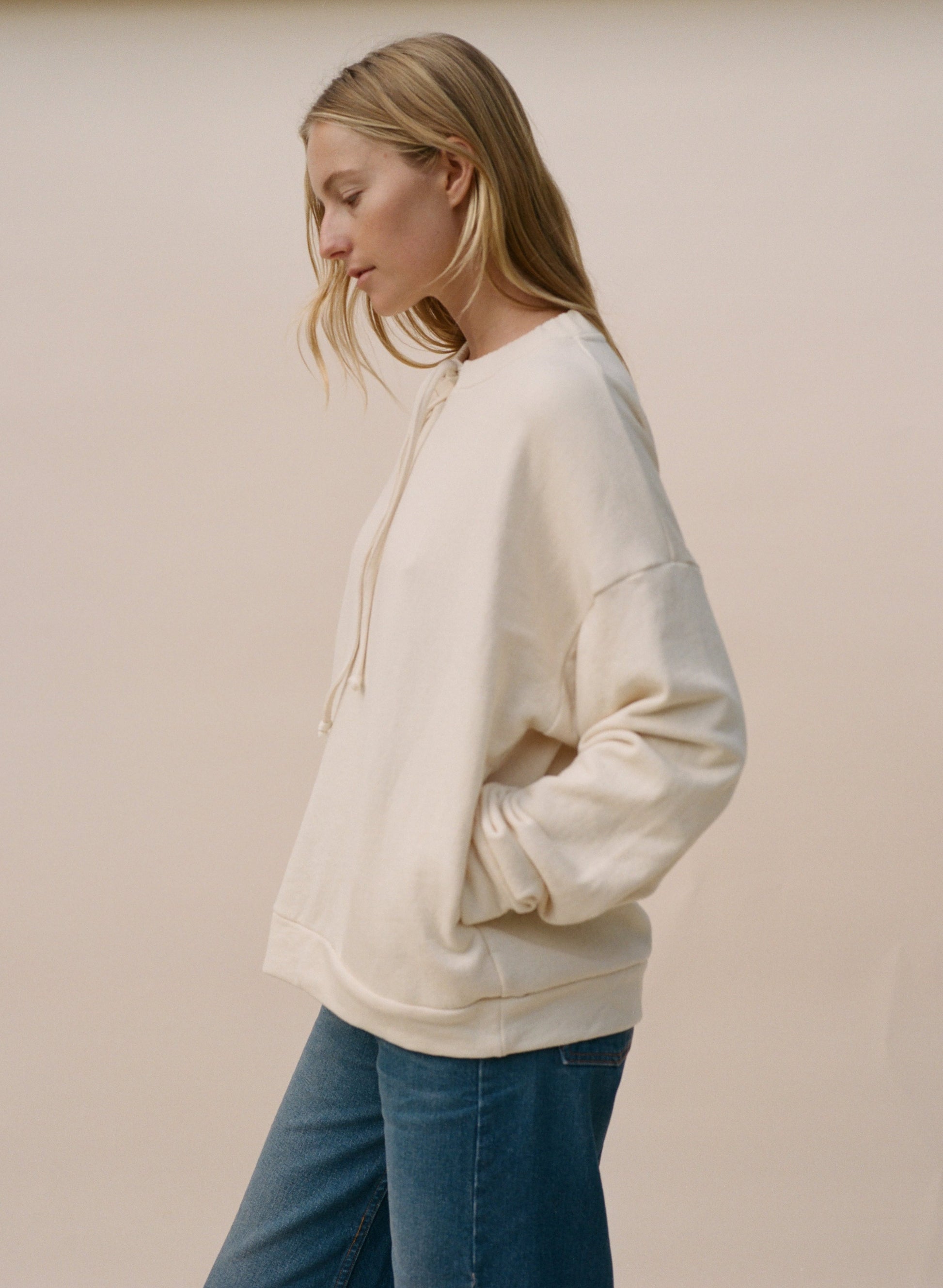 This sweatshirt is made in Los Angeles and features an easy fit with side seam pockets. It has a ribbed hem and cuffs, plus a drawcord at the neck for adjusting and gathering. Crafted from a soft organic cotton french terry and garment dyed.