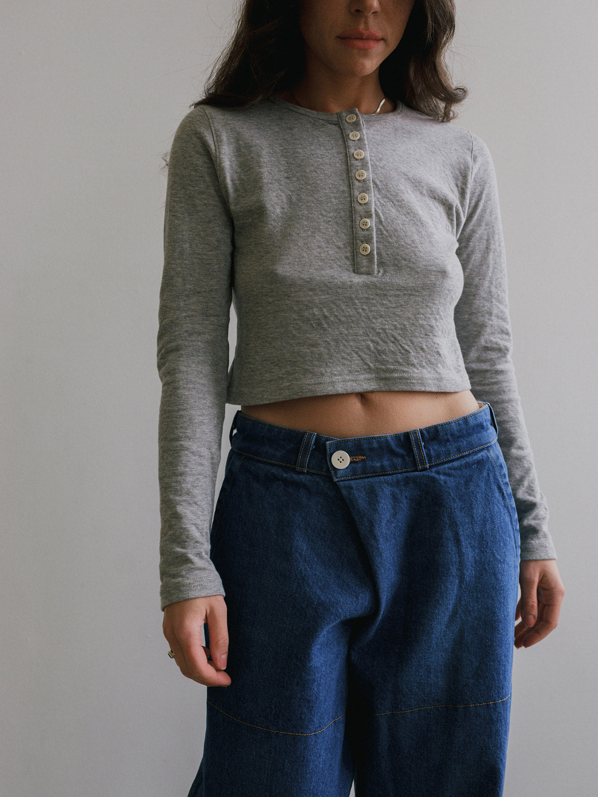 The Cropped Henley Tee features 21 natural corozo nut buttons. Made from the softest double cotton tee fabric in Los Angeles. The Cropped Henley is the perfect elevated tee to pair with your entire closet. Available in 3 colors: Milk, Heather Grey, and Navy.
