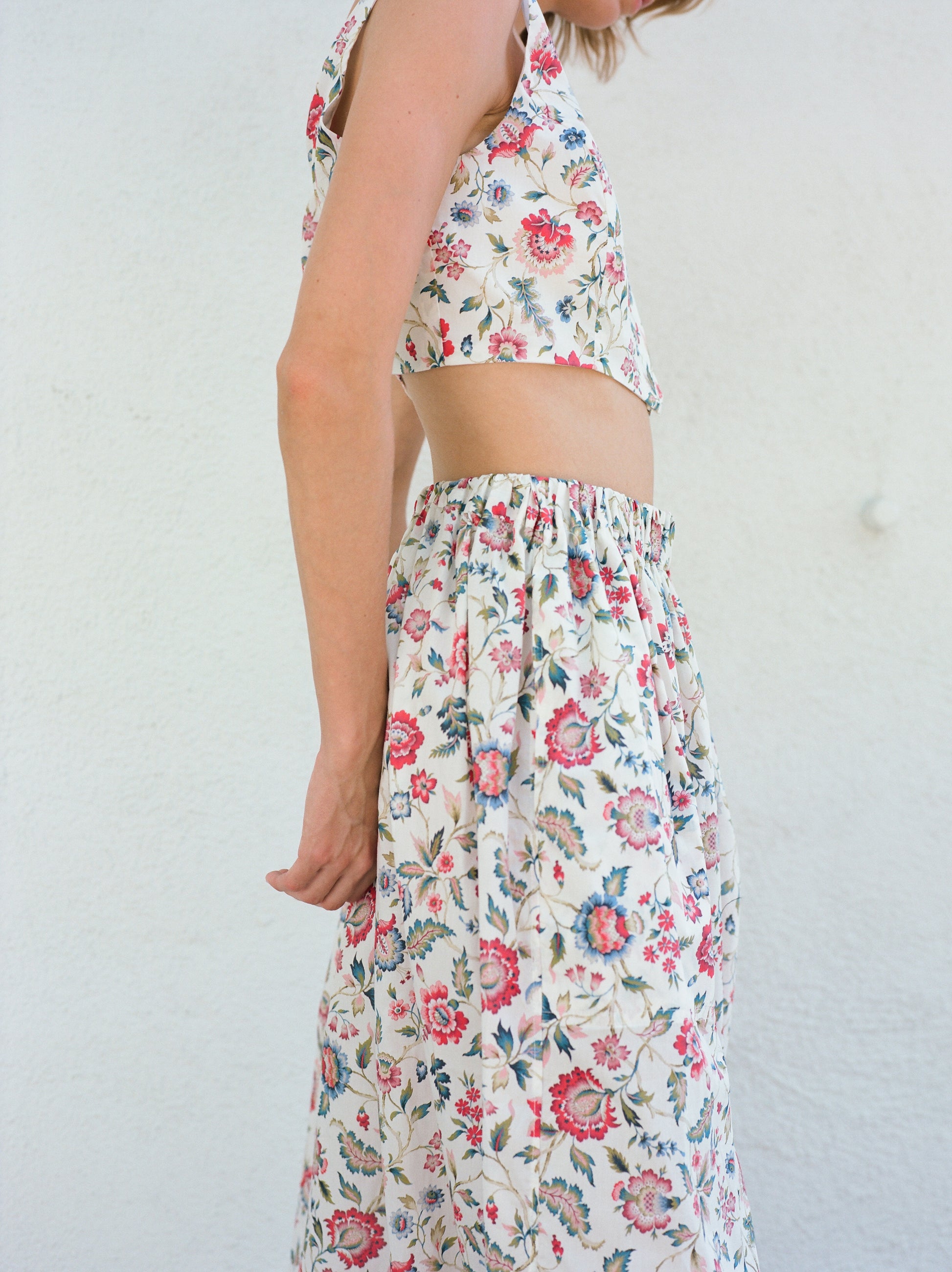 The Evan Maxi Skirt is constructed in classic Liberty of London Tana Lawn Cotton. Perennial Floral is reminiscent of French country chintz designs. With elasticated waist band for ease and a wrapping front detail this is the ultimate skirt for warmer days ahead. The 2 large pockets are perfect for stashing phones and keys, or collecting rocks and shells.