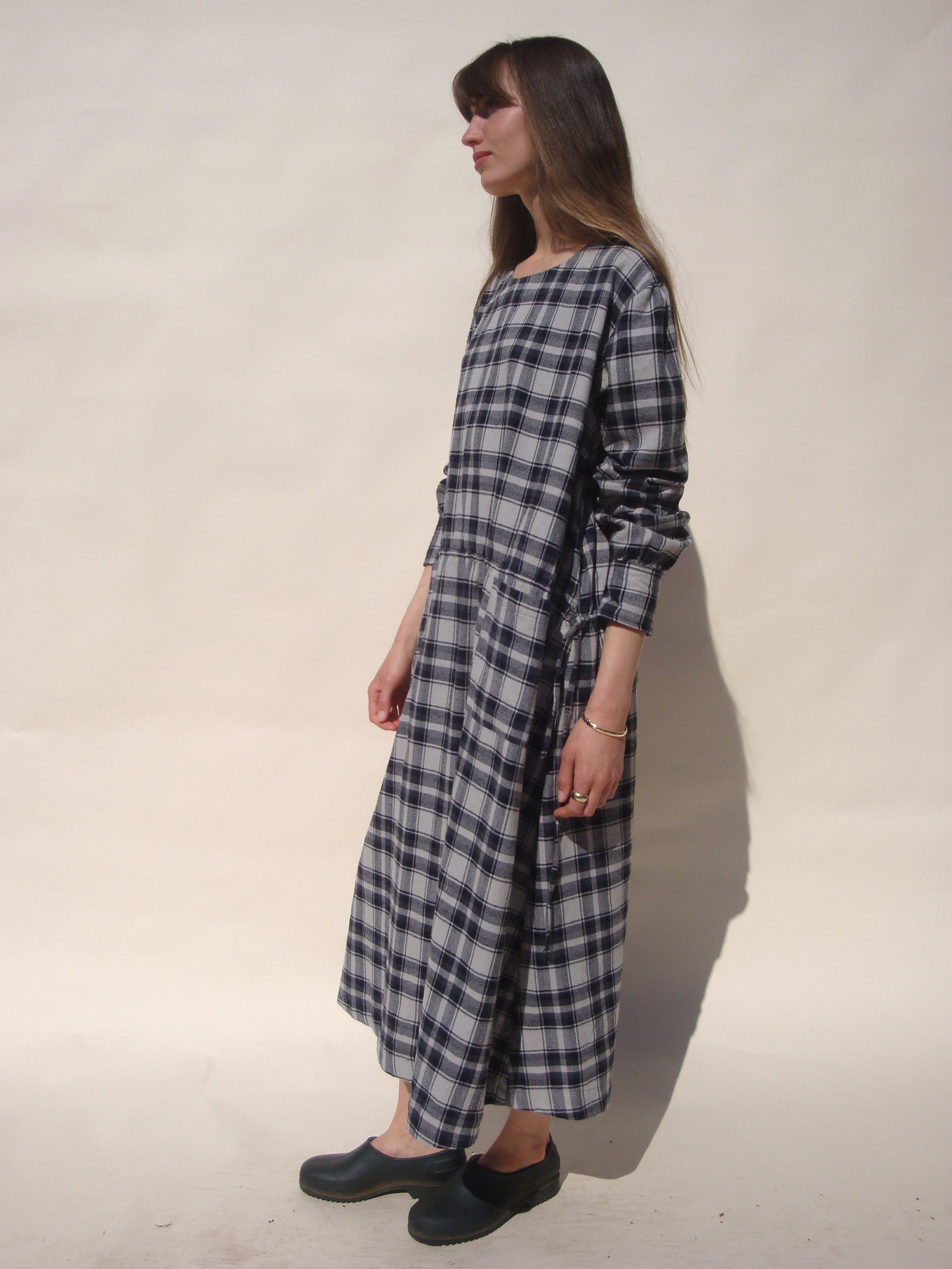 The Fleur Easy Dress is a laid-back staple dress. Designed with an easy, relaxed body, it features a functional drawstring waist for adjustable shape, patch pockets for utility, and a buttoned cuff for a hint of structure. Made for fall in a Japanese cotton/silk tartan, this fabric has a soft, almost flannel hand.