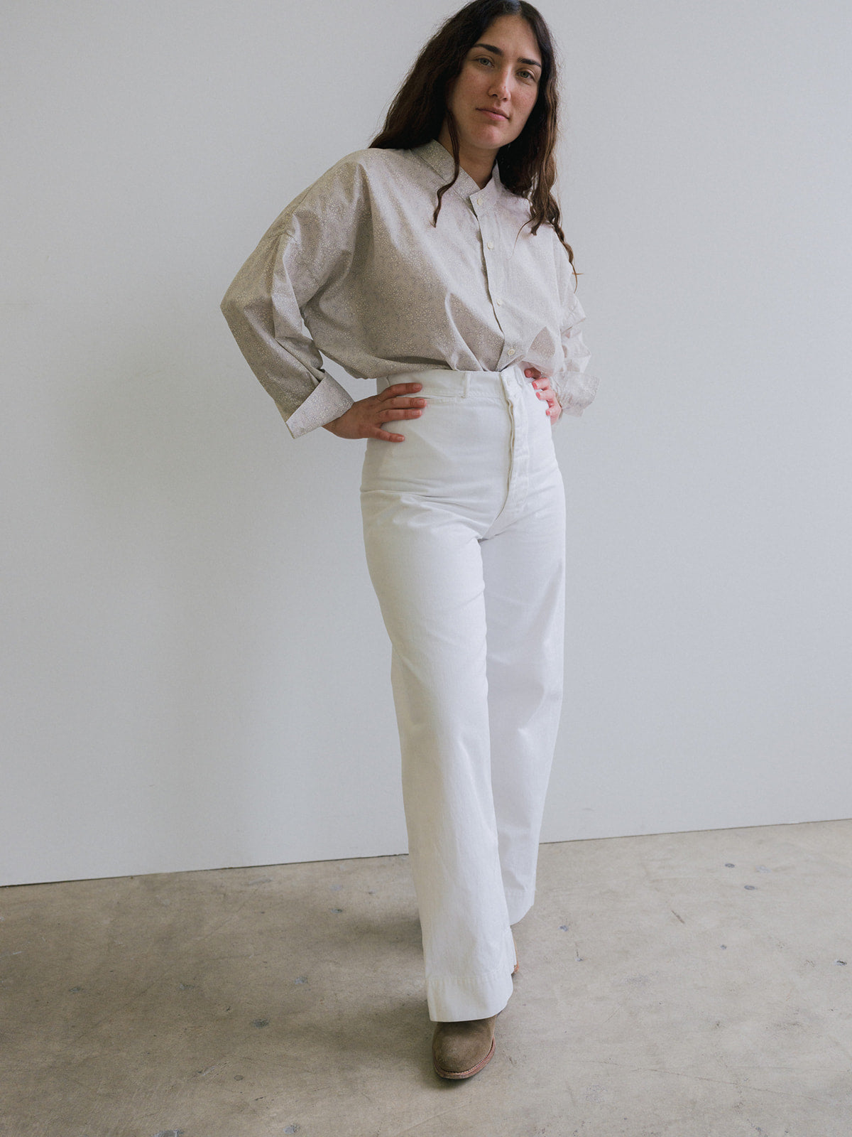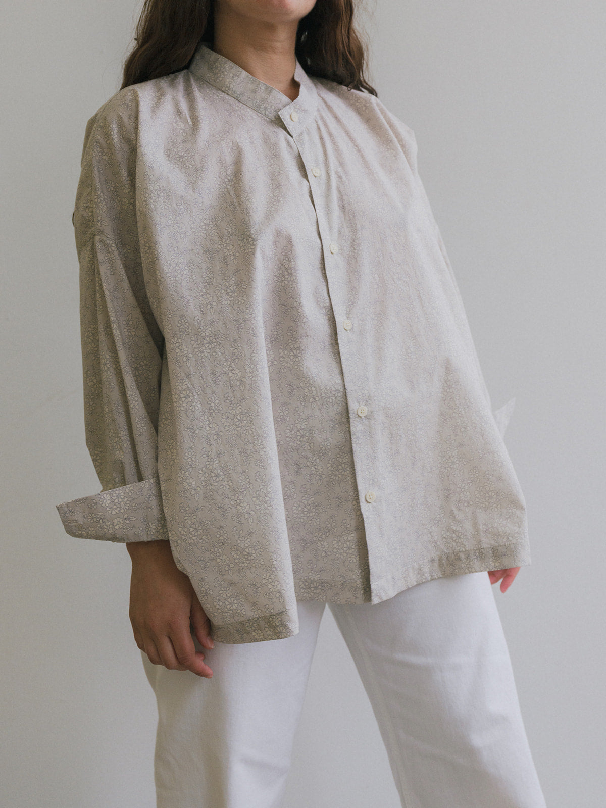 The Folly Shirt is a staple piece in a Liberty of London floral print. This button-down has a relaxed, oversized shape that can be tucked in or worn loose for versatile styling options. With its distinct lack of collar, it adds a touch of modernity to any outfit.
