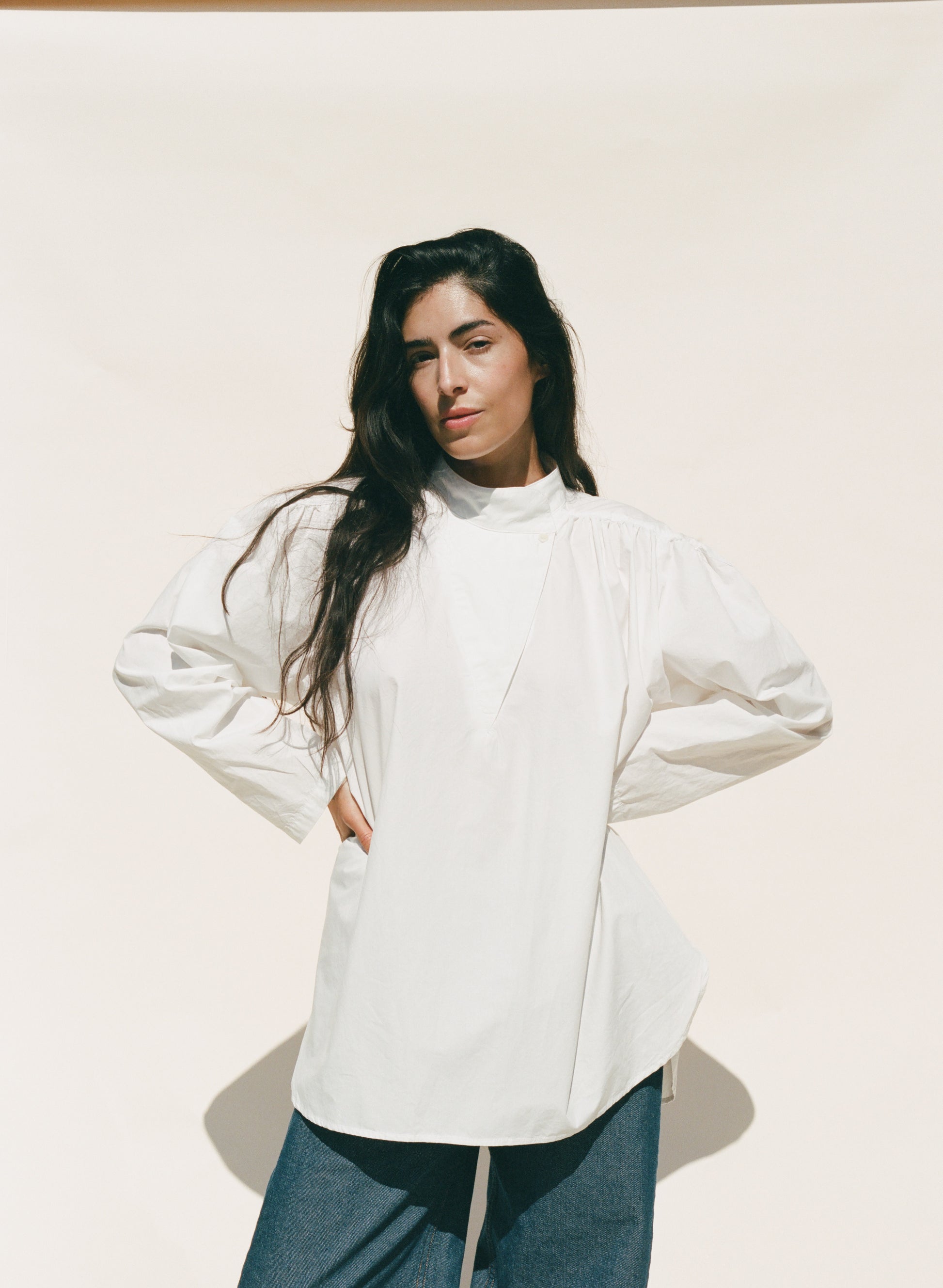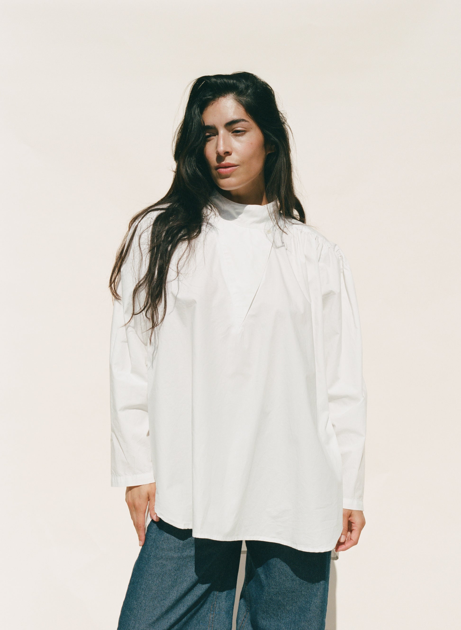 The Laila Shirred Blouse is an easy-fitting, oversized tunic. It features a triangle shaped front opening with inner and outer button closure that can be worn closed or flipped open. Shoulder yokes featured shirring and a subtle gathered texture to the simple silhouette.