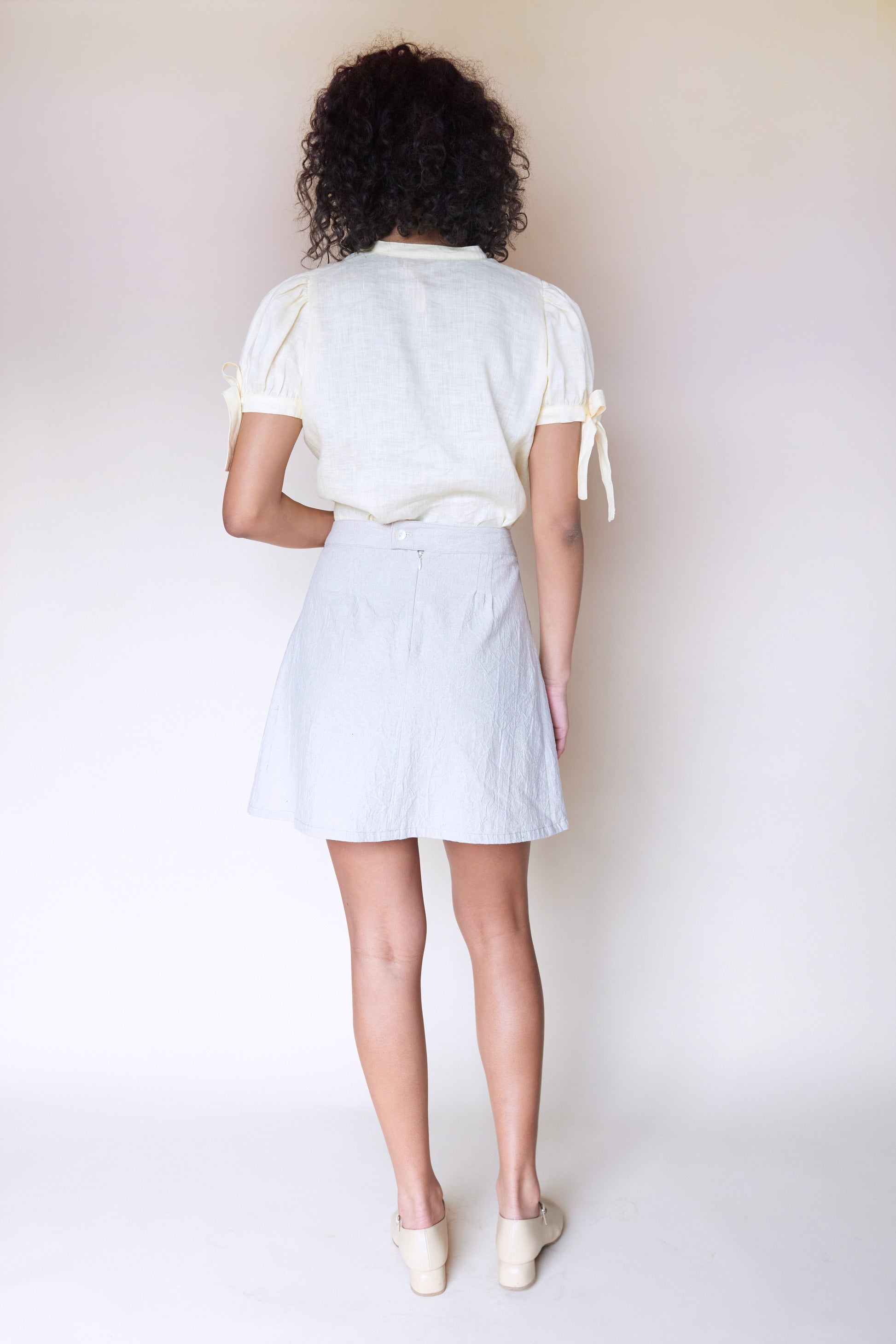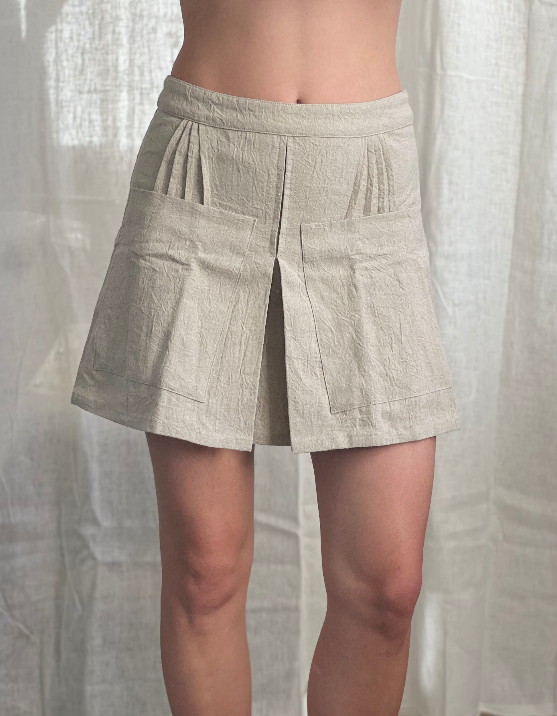 In a crinkled Linen/Cotton fabric, the Leon Mini Skirt is a play on classic tennis skirt. Featuring a high waist pleats at each hip, oversized pockets, and a back zipper plus button closure at waist.