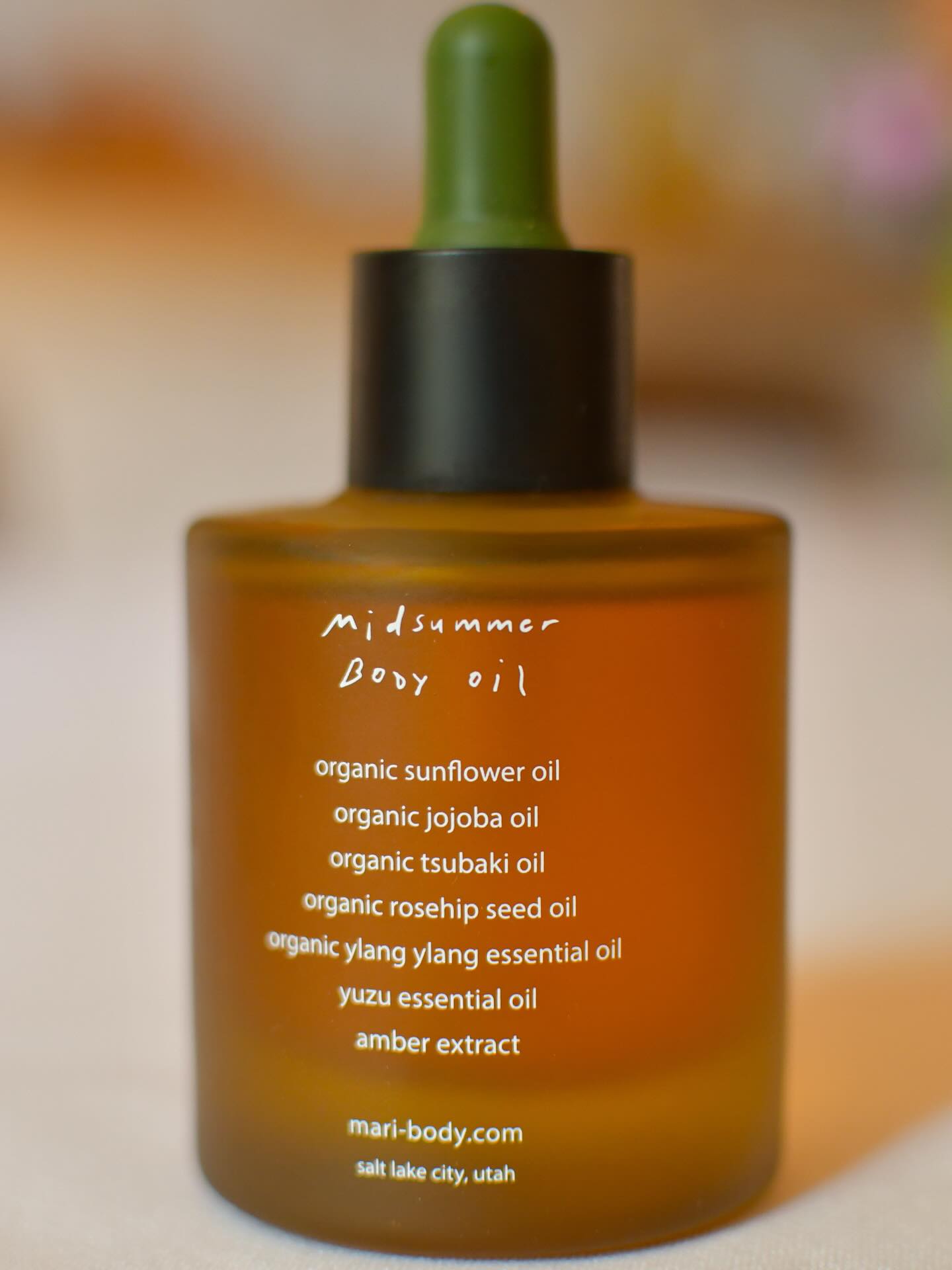 Mari body oil is moisturizing, nourishing and hydrating with a rich scent, fragranced with 100% natural essential oils and resins. Always microbiome-friendly and non-comedogenic, we use oils that are full of plant collagen, vitamin c and a to help maintain skin suppleness while fighting sun damage and strengthening our skin barrier. Our midsummer scent is sweet and floral with sparkling citrus and earthy notes.