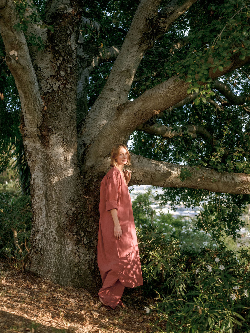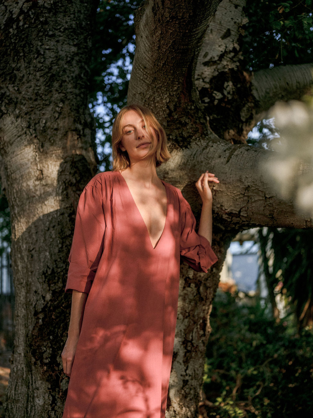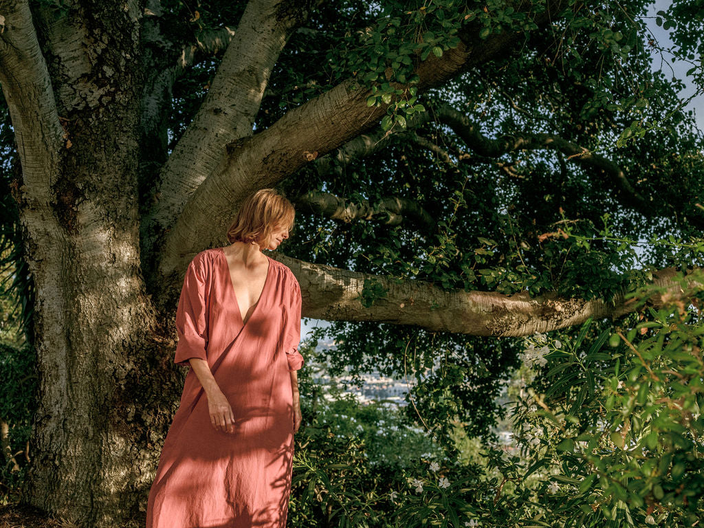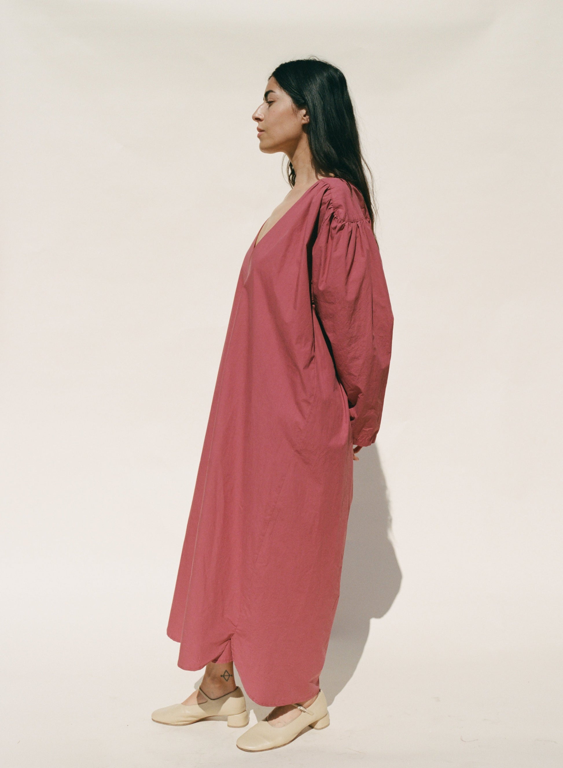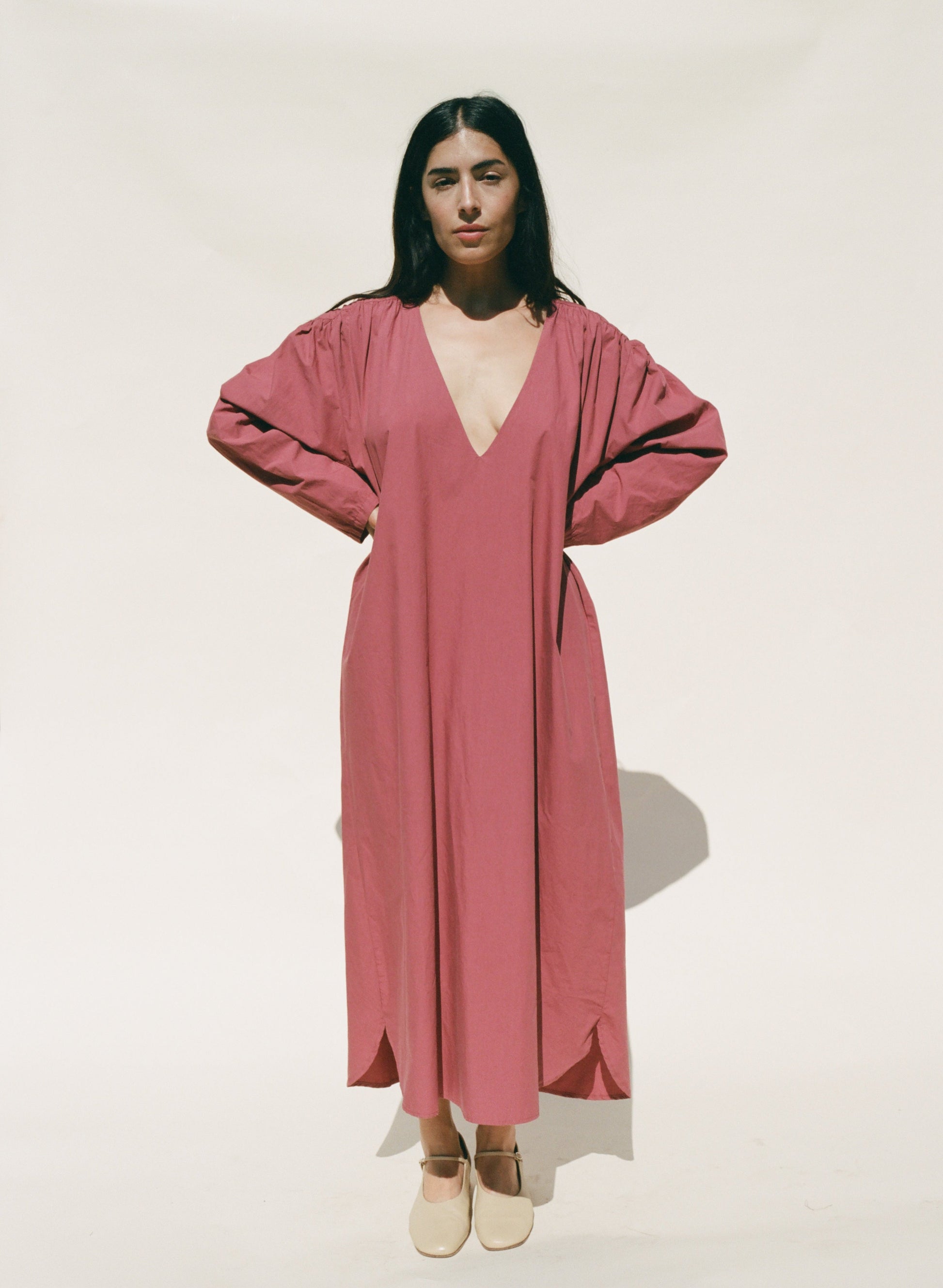 The Laila Shirred Dress features a relaxed, oversized fit with an open V-neckline. Shoulder yokes featured shirring and a subtle gathered texture to the simple silhouette. Made from soft cotton poplin.