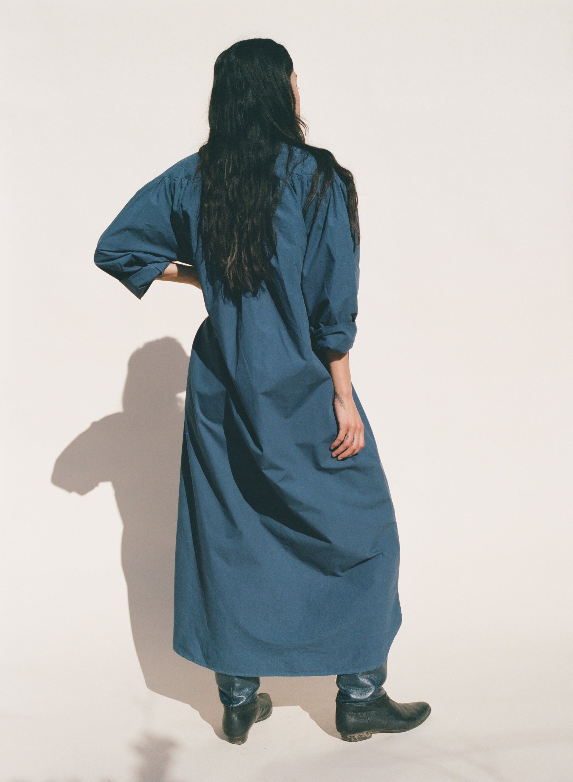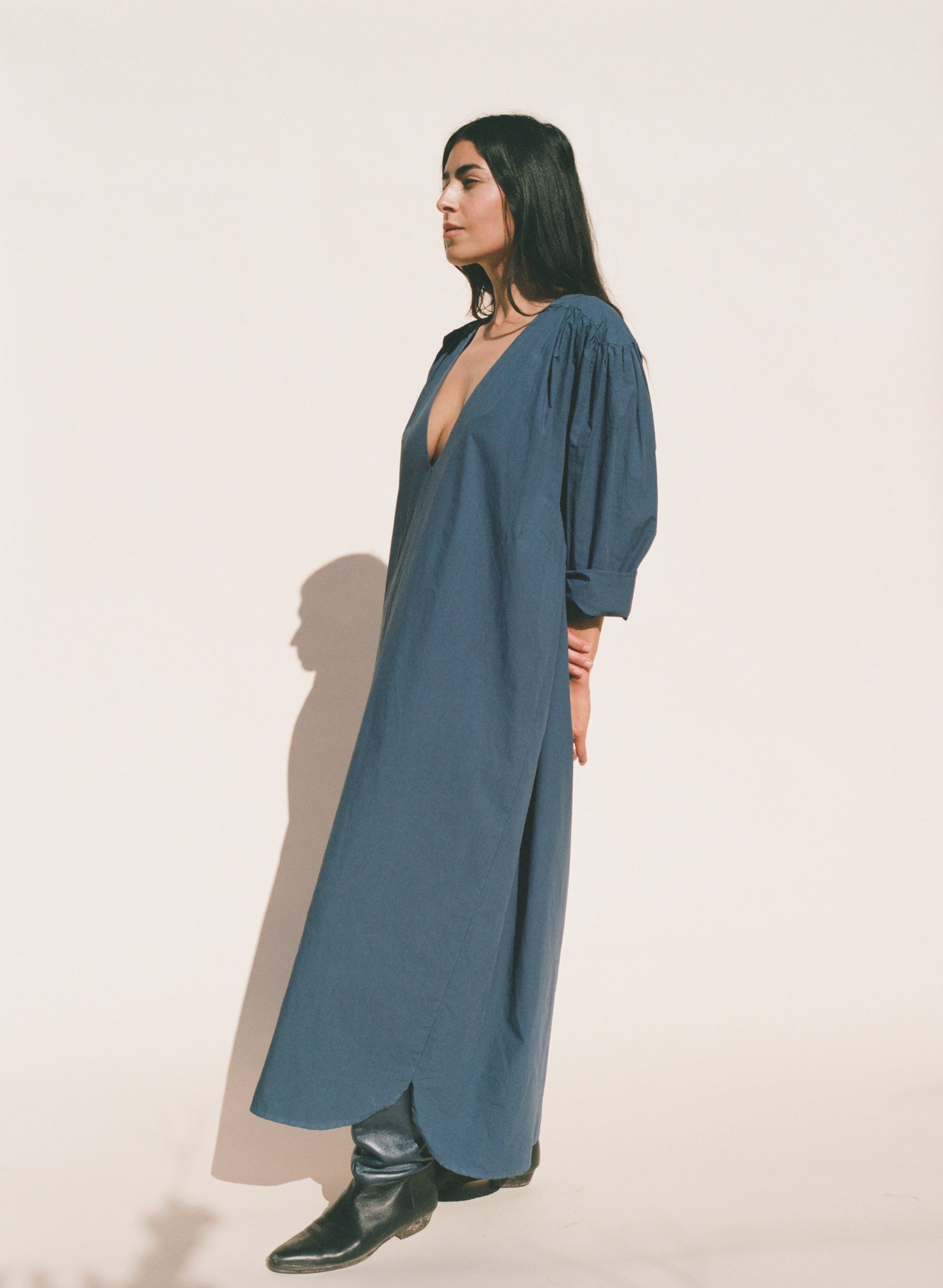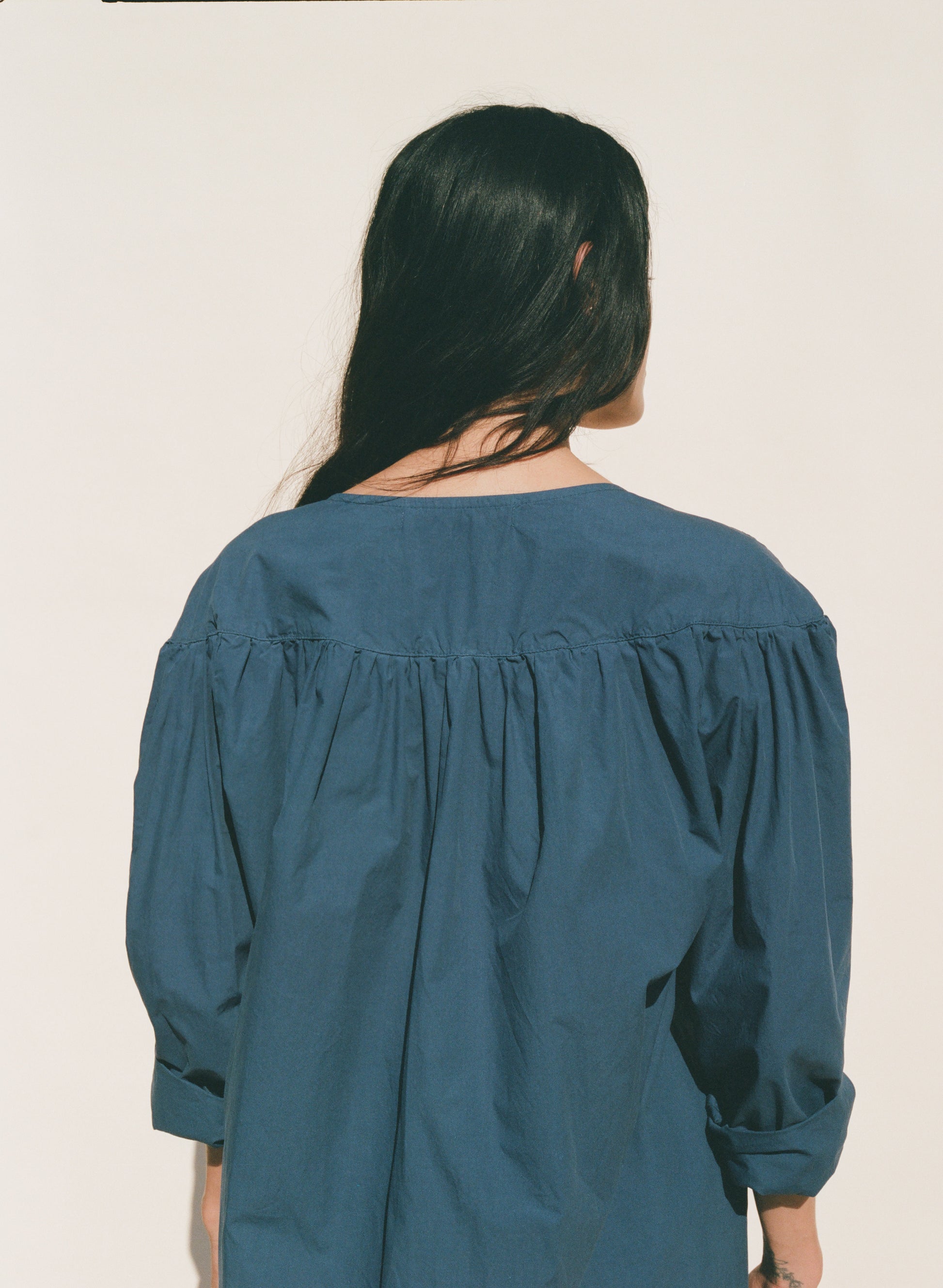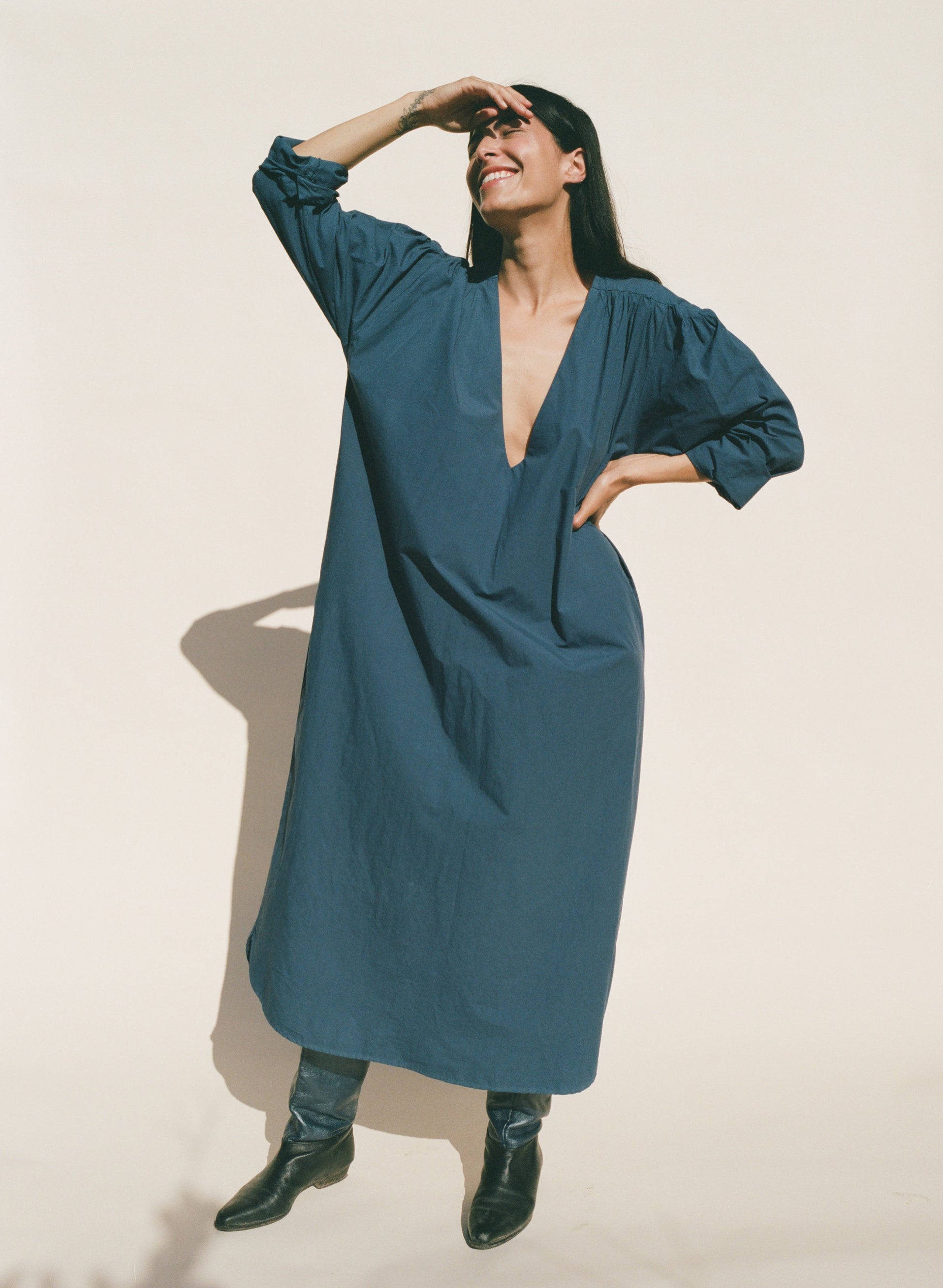 The Laila Shirred Dress features a relaxed, oversized fit with an open V-neckline. Shoulder yokes featured shirring and a subtle gathered texture to the simple silhouette. Made from soft cotton poplin.