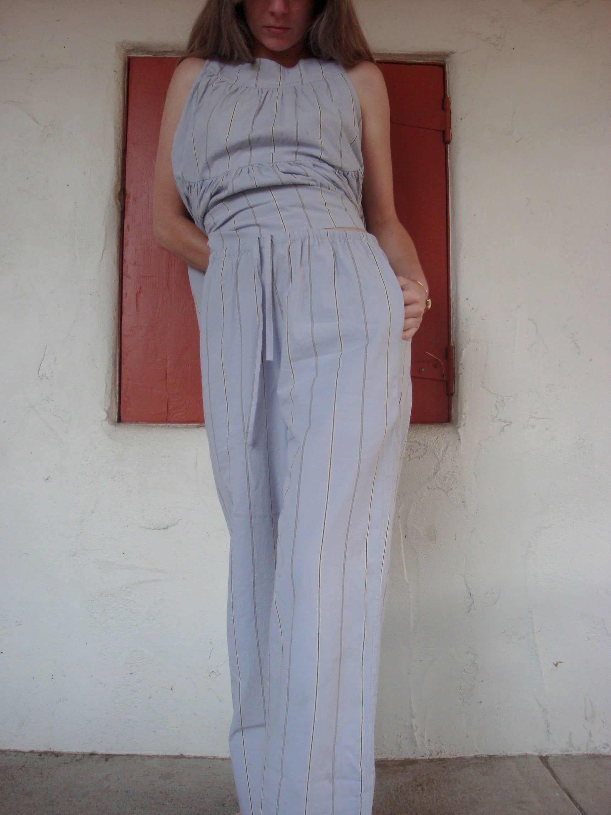The Patti Pant is a relaxed style, crafted from a striped Japanese organic cotton. Designed for all-day comfort, it features an elastic waistband with an inner drawstring for a customizable fit, side seam pockets, and a wide hem. Versatile and effortless, these pants pair perfectly with the Carmen Swing Top for a coordinated look.