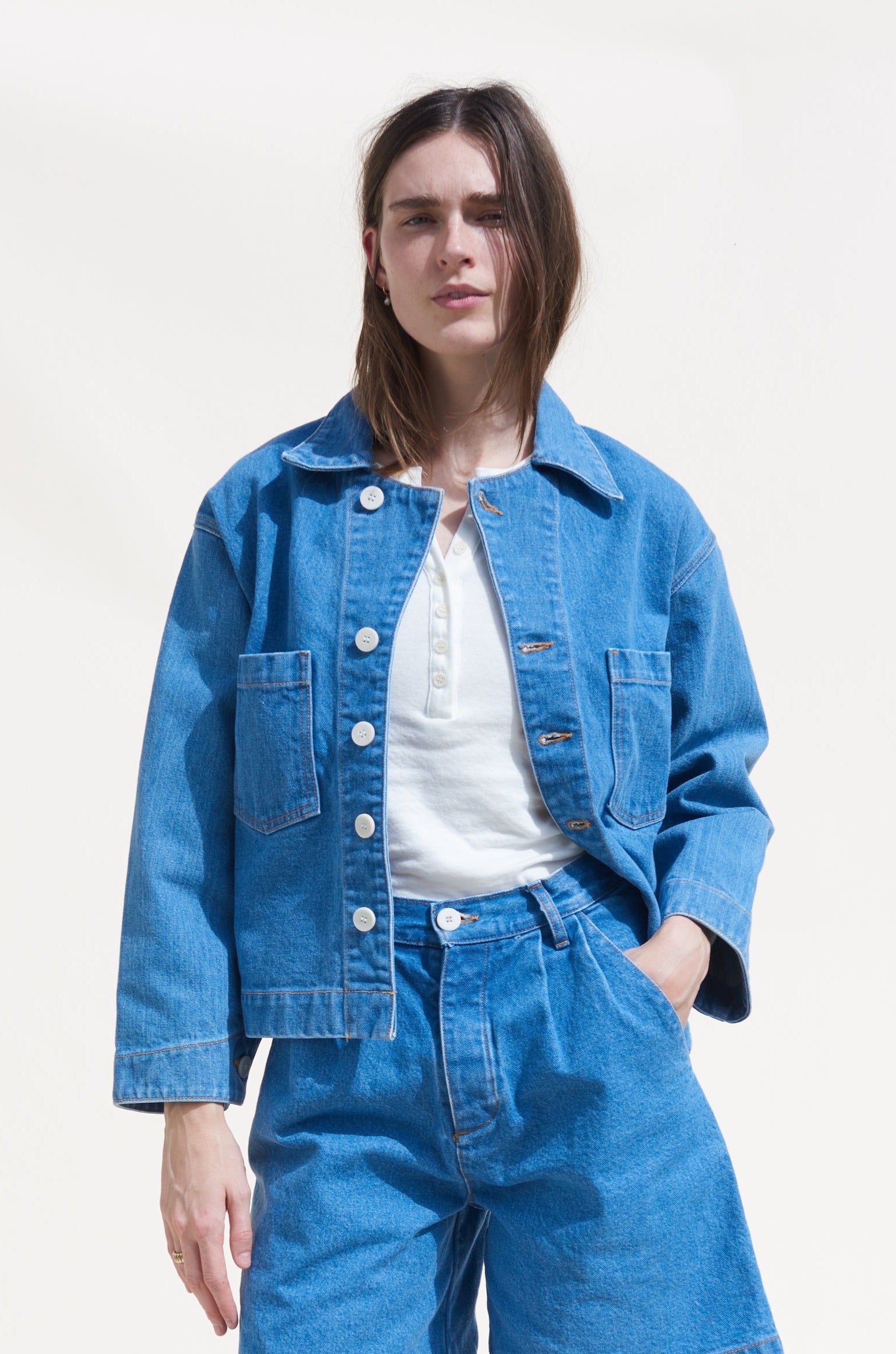The Pine Jacket is a slightly cropped piece with a corozo button front and boxy fit. Made from a 14 oz heavyweight broken weave denim in Los Angeles. This style will take you from summer to fall and back again for years to come.