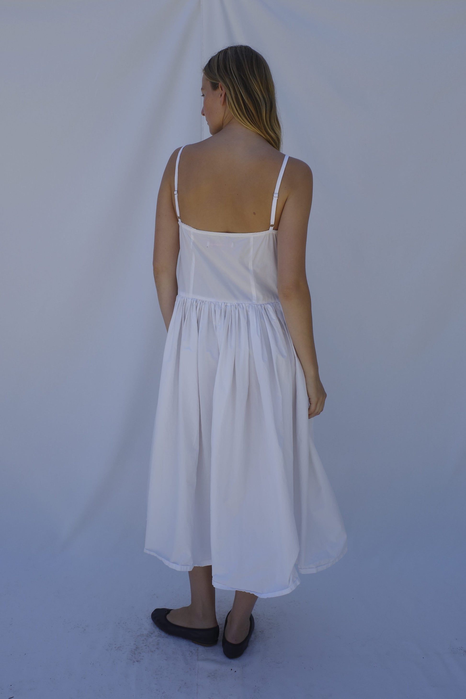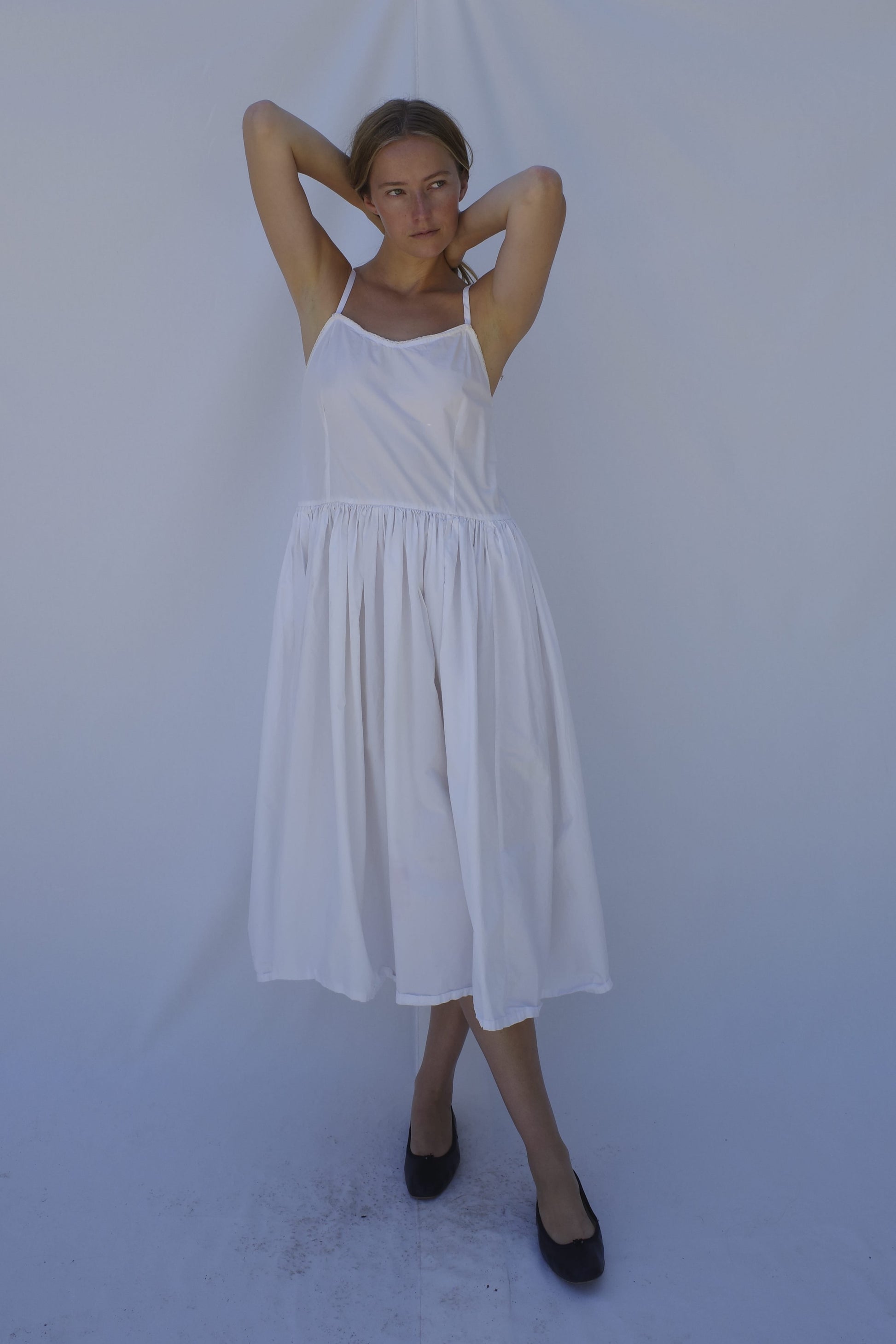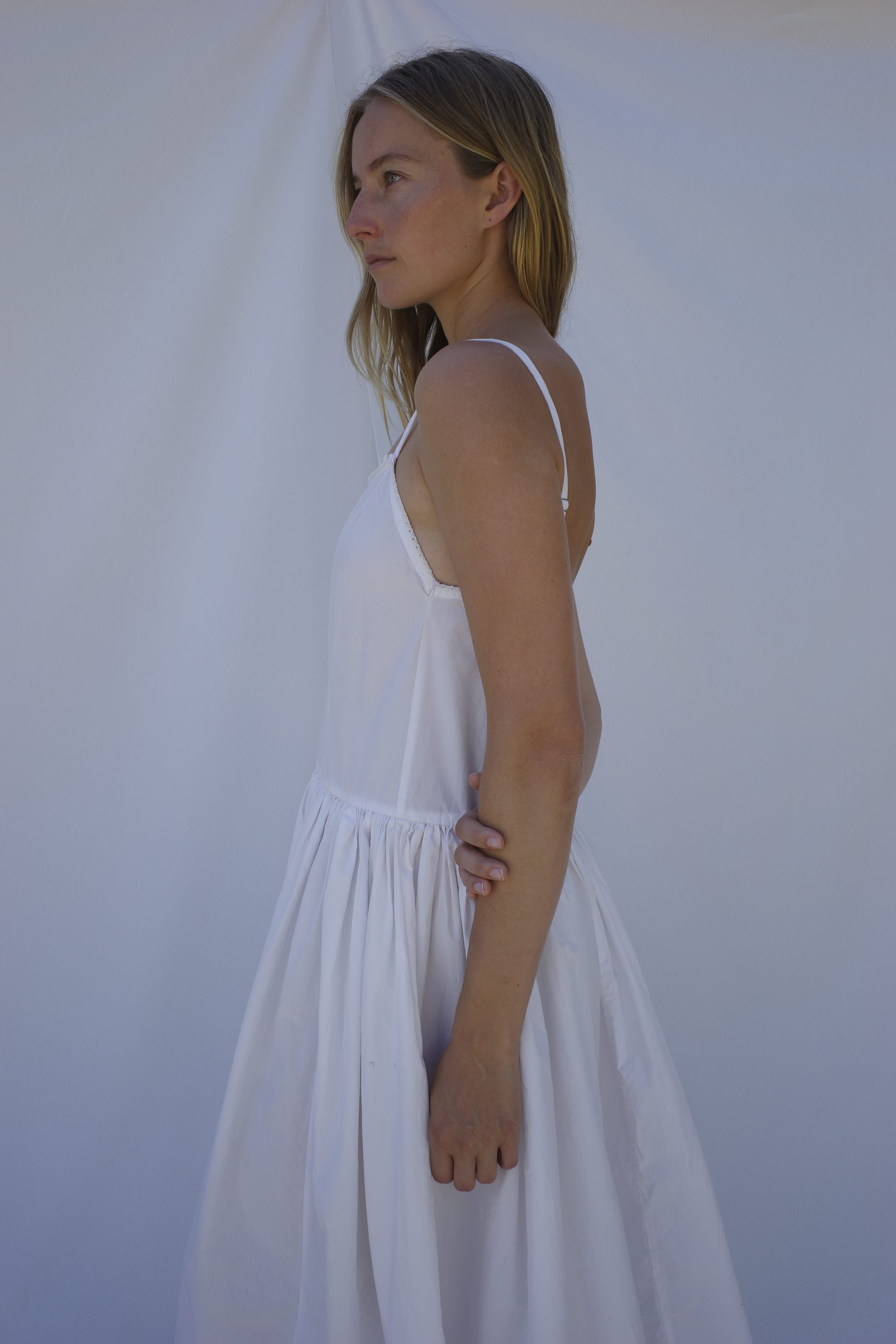 The Ritual Dress is a tank-style dress with a gathered full skirt and lace trim at the neckline. Made from our Washed Cotton Poplin, it has a simple bodice and a flowing skirt that adds movement. Straps are adjustable.