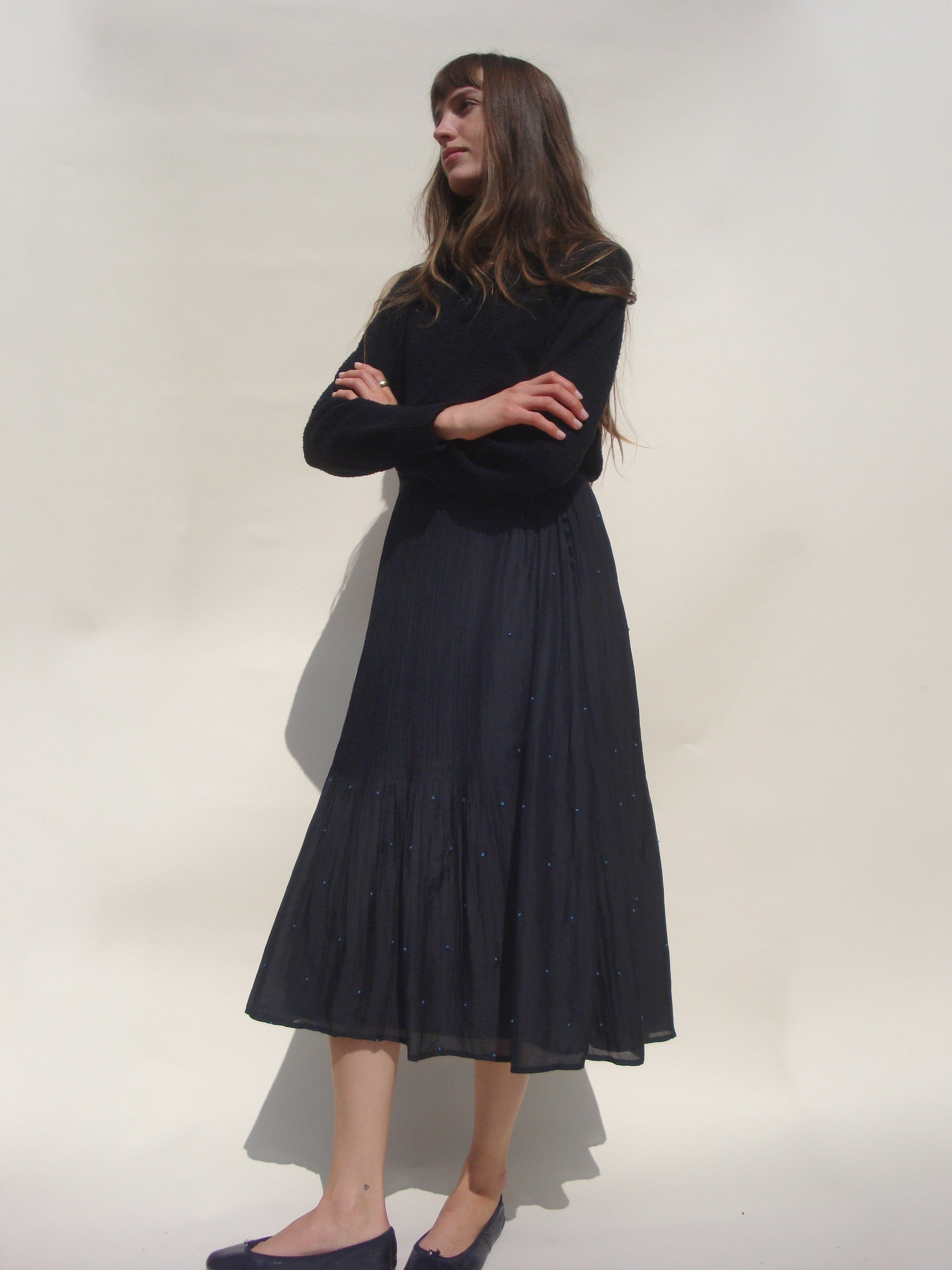 The Romy Pintuck Skirt features a flat front waist with elastic at the back for comfortable, adaptable sizing. Detailed with pintucks throughout and finished with self-covered buttons at the side, this skirt also features hand-embroidered french knots.