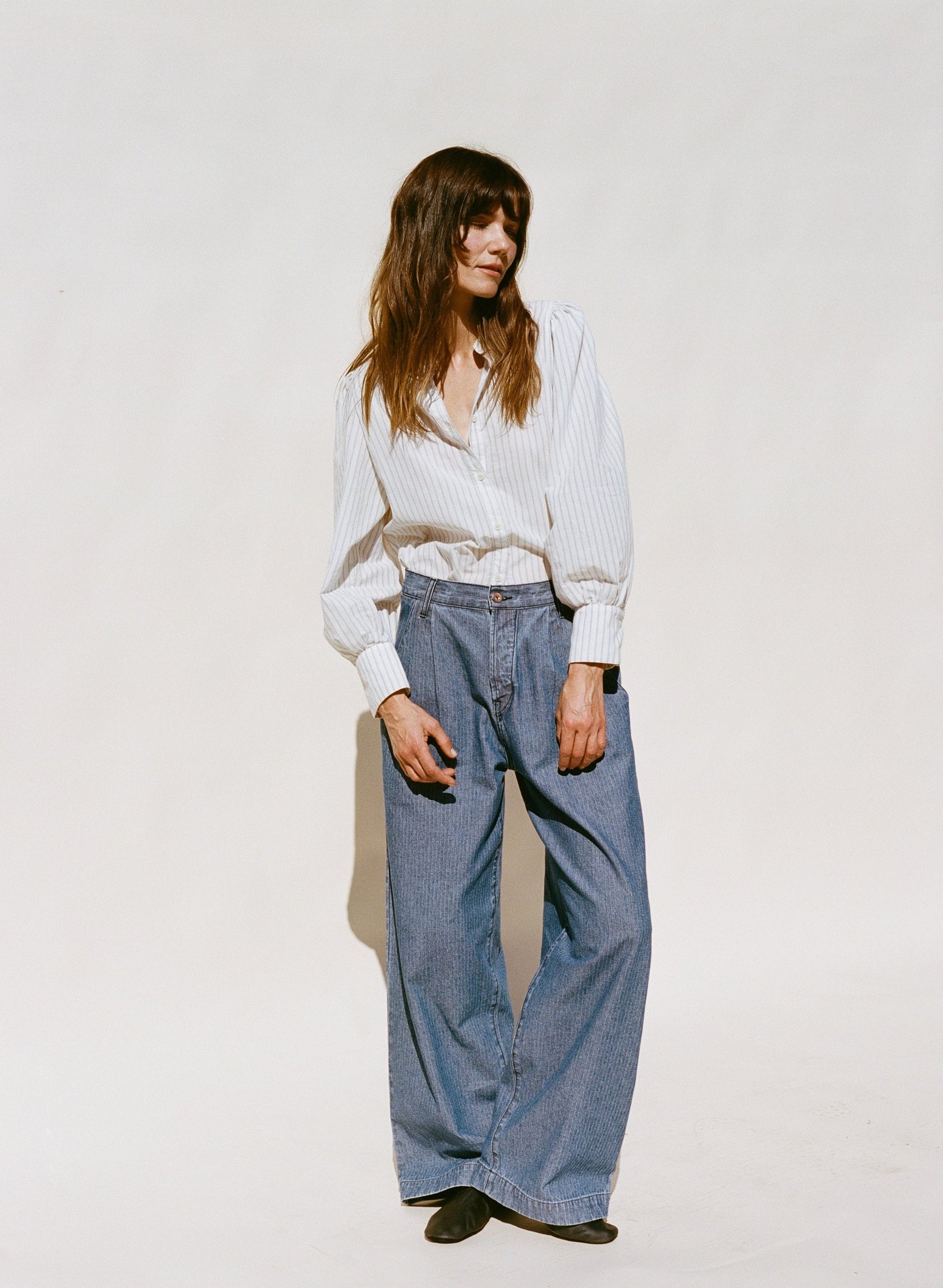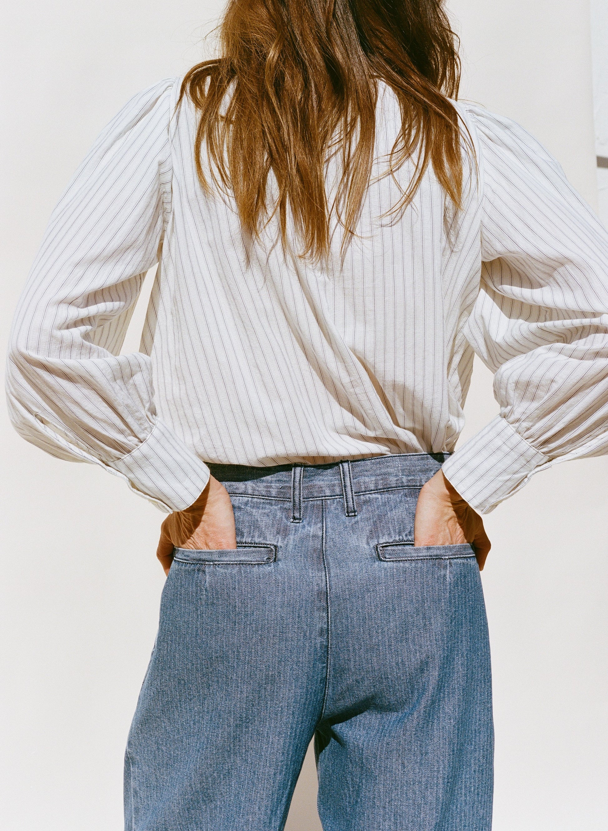The Tati Trouser is our newest pant style, made from 100% cotton denim herringbone fabric and rinsed for a soft hand feel while maintaining an even tone throughout. It features front pleats, deep side pockets, back welt pockets, and a secure button fly.
