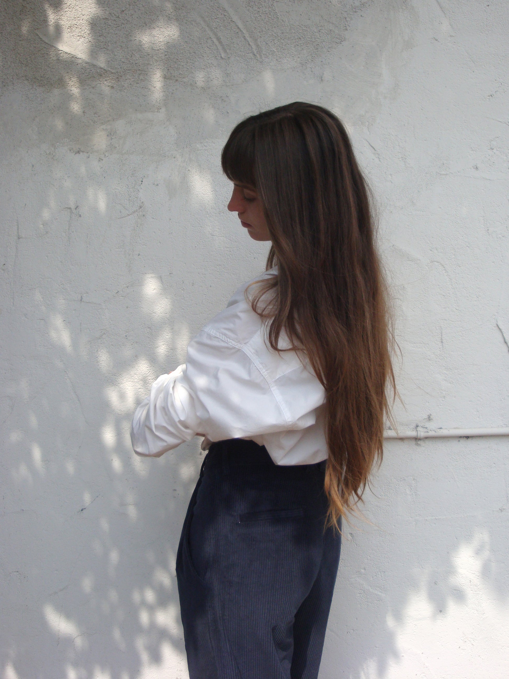 The Tati Trouser is made from a Japanese wide wale corduroy fabric. It features front pleats, deep side pockets, back welt pockets, and a secure button fly.